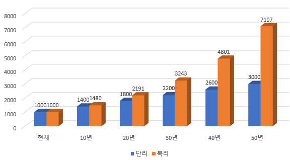 단리와 복리의 차이점은 위 그래프처럼 극명한 수익률로 나타납니다.