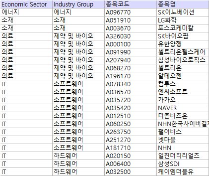 | 섹터 | 섹터별 기준지수 | 선정기준 |
