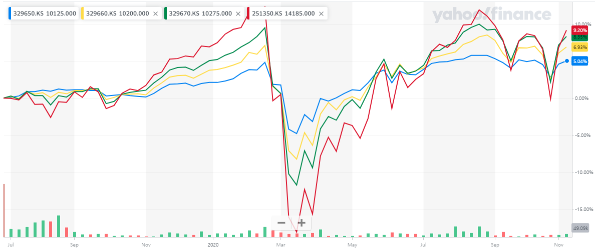 이 3종 ETF가 상장한 2019년 7월부터 2020년 11월까지 성과를 비교한 그래프를 보겠습니다.