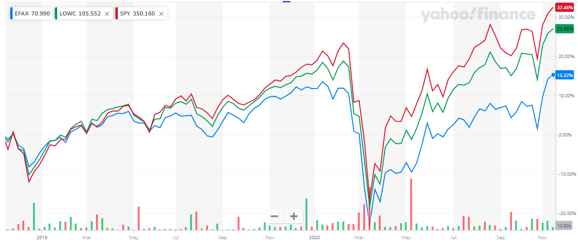 코로나 사태 이후, SPY > LOWC > EFAX 순으로 좋은 수익률을 보여줍니다.