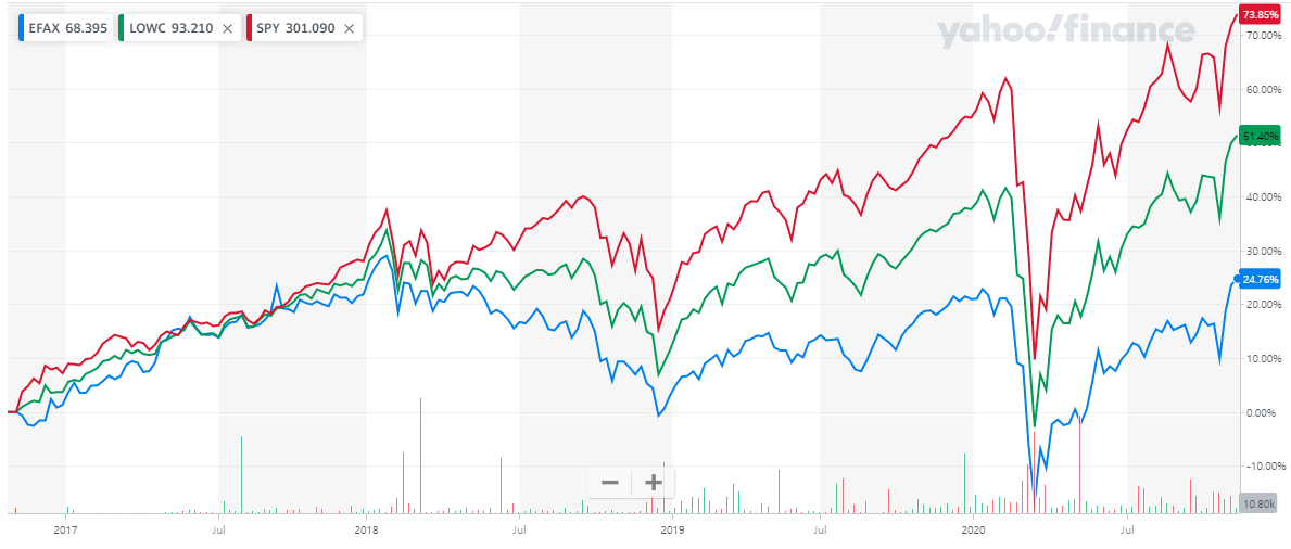 4년간 투자를 했더라면 SPY > LOWC > EFAX 순으로 좋은 수익률을 보여줍니다.