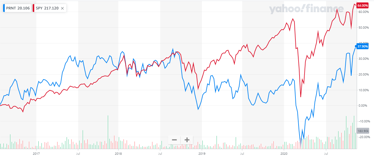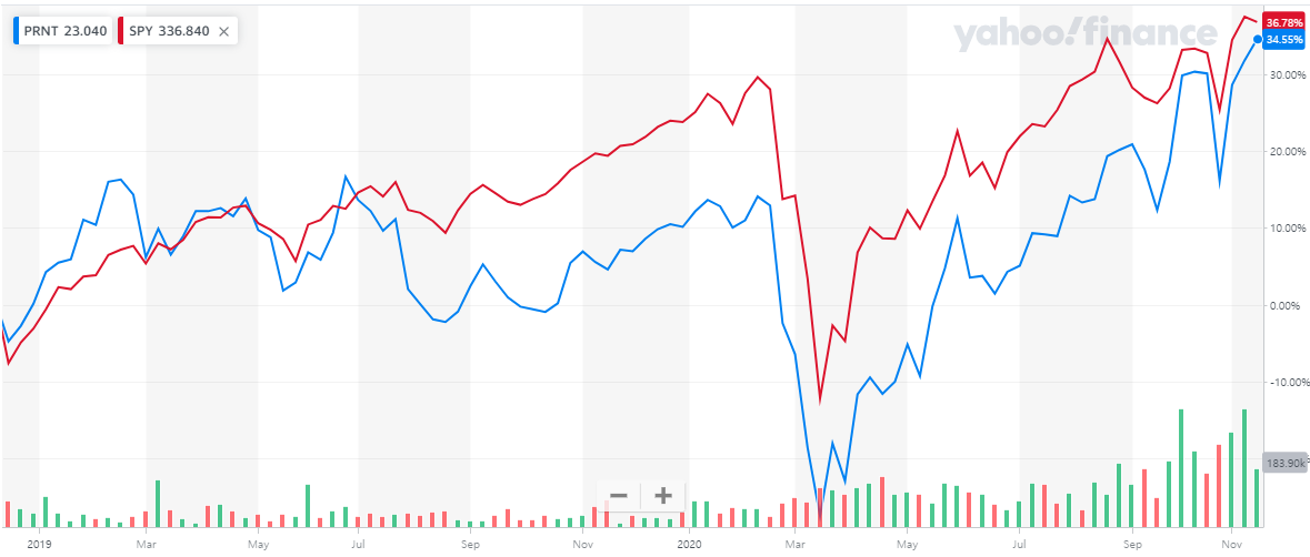 PRNT를 미국 S&P500지수를 추종하는 ETF인 SPY와 비교해보겠습니다.