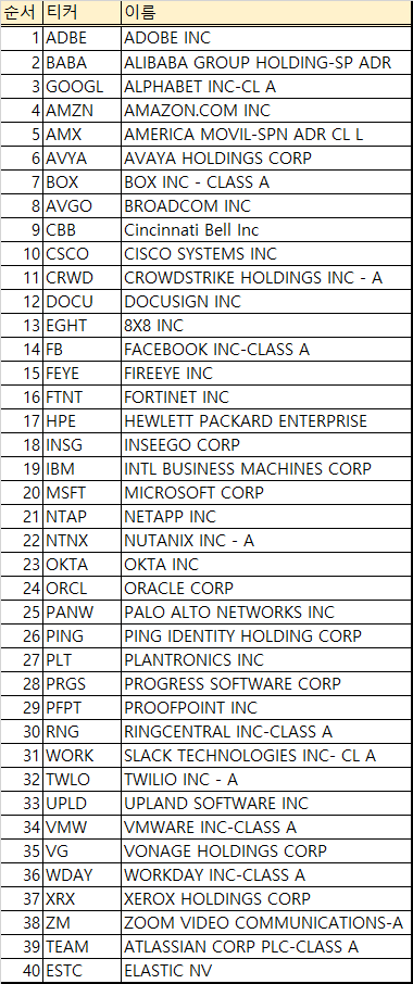 WFH는 총 40개 종목으로 구성되어 있으며, 우리가 익히 들어봤던 알리바바, 구글, HP, 아마존과 같은 IT기업이 많이 보이네요.