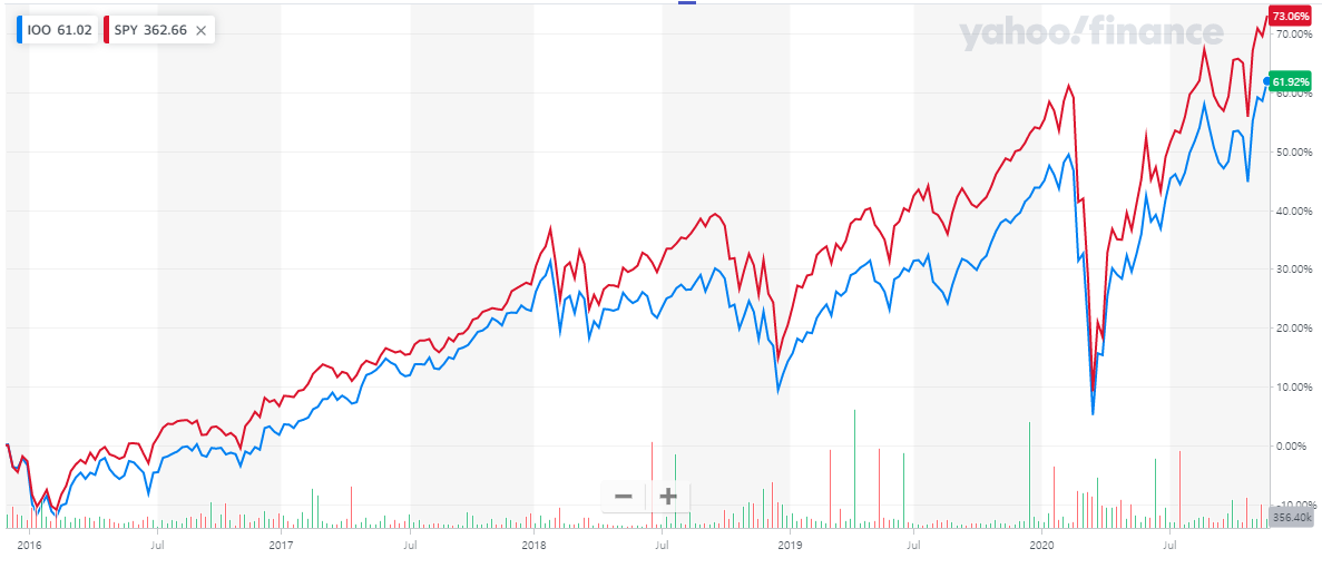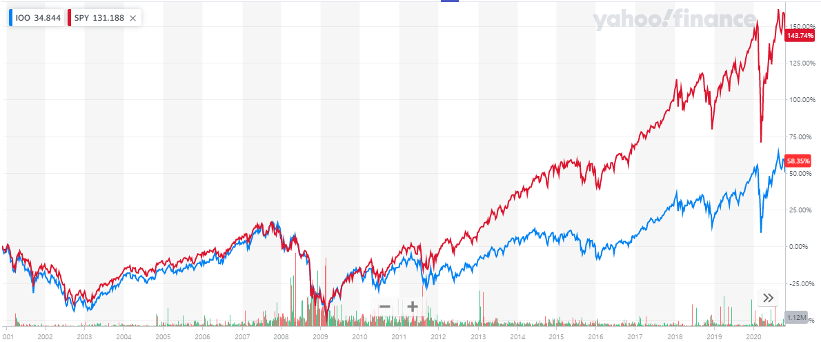 IOO가 상장한 2000년부터 2011년까지 SPY와 굉장히 유사한 성과를 보여줍니다.