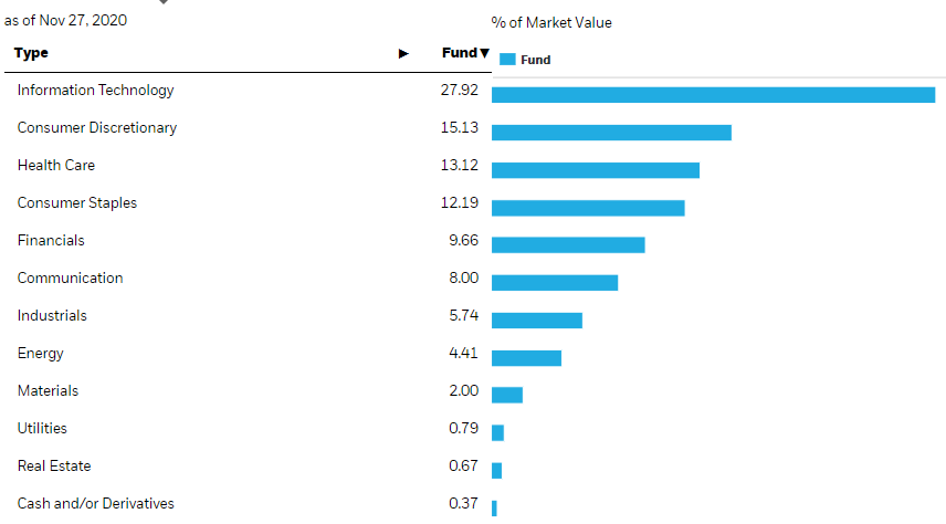- IT, 소비재, 헬스케어 업종에 가장 많은 비율이 투자되어 있습니다.