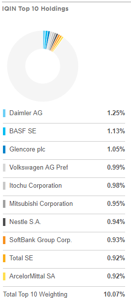 - IQIN에서 가장 비중이 높은 종목은 독일의 다임러입니다. 하지만 1.25%밖에 포함되어 있지 않습니다. 500개의 다양한 종목을 편입하기 때문에 개별 종목의 비중은 적은 편입니다.