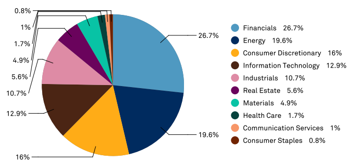 SPHB를 구성하는 포트폴리오 중 거의 대다수는 금융, 에너지, 소비재에 할당되어 있으며, 통신주나 소비자 비순환 종목은 제외된 상태입니다.
