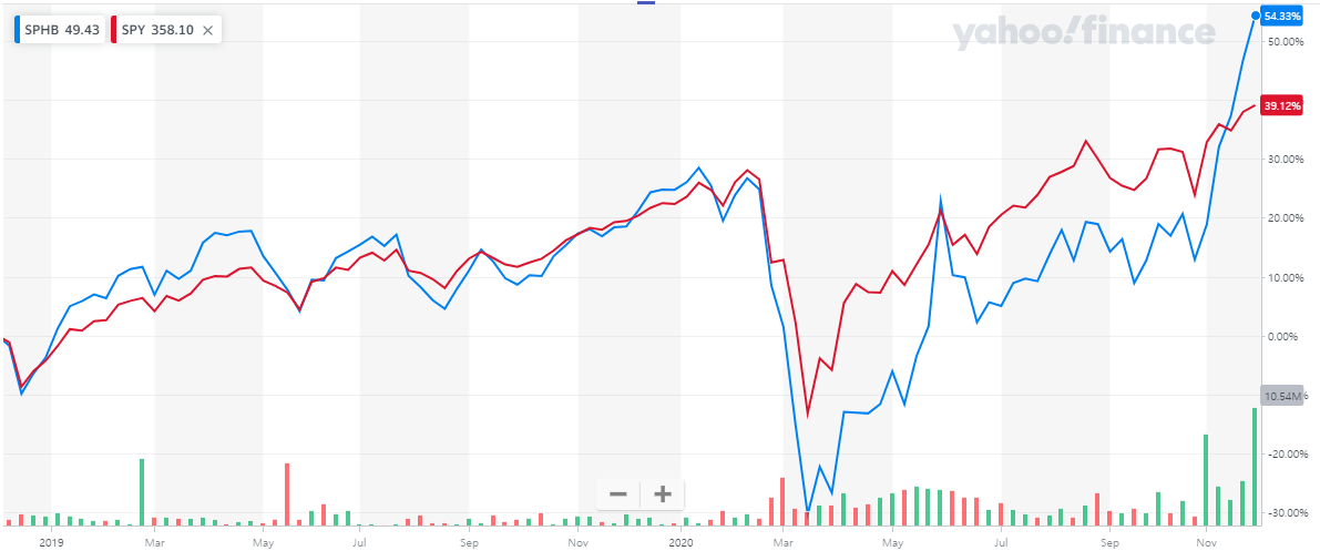 그러나, 약 1달의 성과만 놓고 볼때는 SPHB가 11% 정도 더 많이 상승했네요.