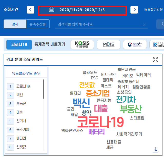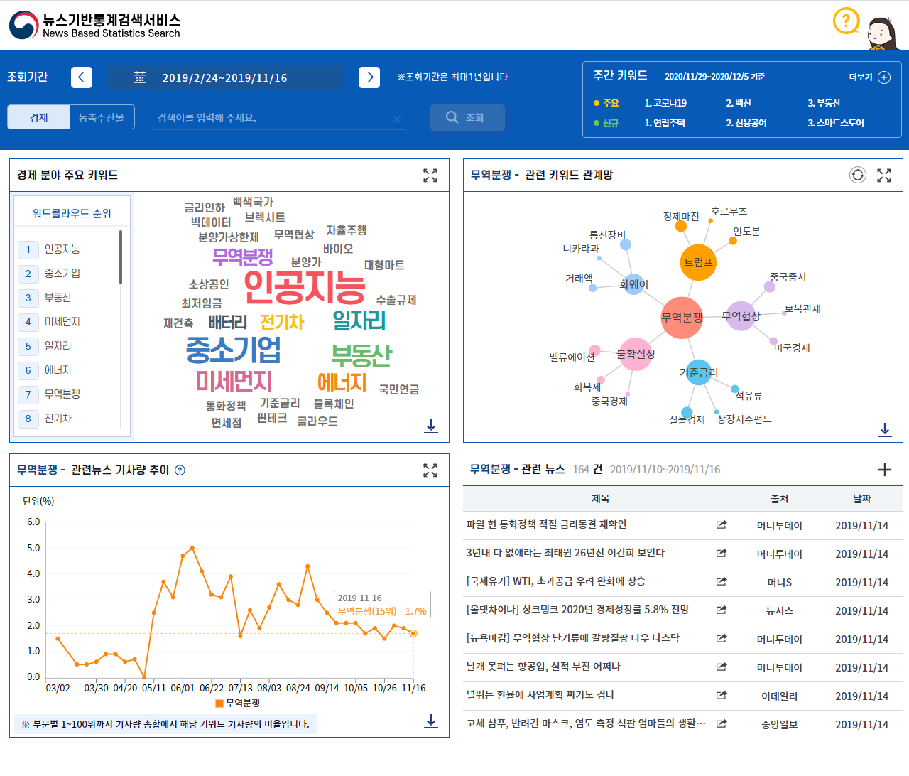 통계청에서는 "뉴스기반통계검색서비스"라는 시스템을 운영하고 있는데요, 온라인에서 수집한 뉴스 빅데이터를 기반으로 경제와 농축수산물 부문에 대한 키워드 분석 결과 및 통계 자료를 검색할 수 있는 기능을 제공한다고 합니다.