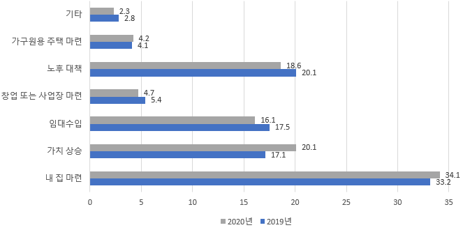 - 2019년에 비하여 부동산 구입 의향은 0.5%p 줄어든 반면에 나머지 항목은 소폭 증가했습니다.