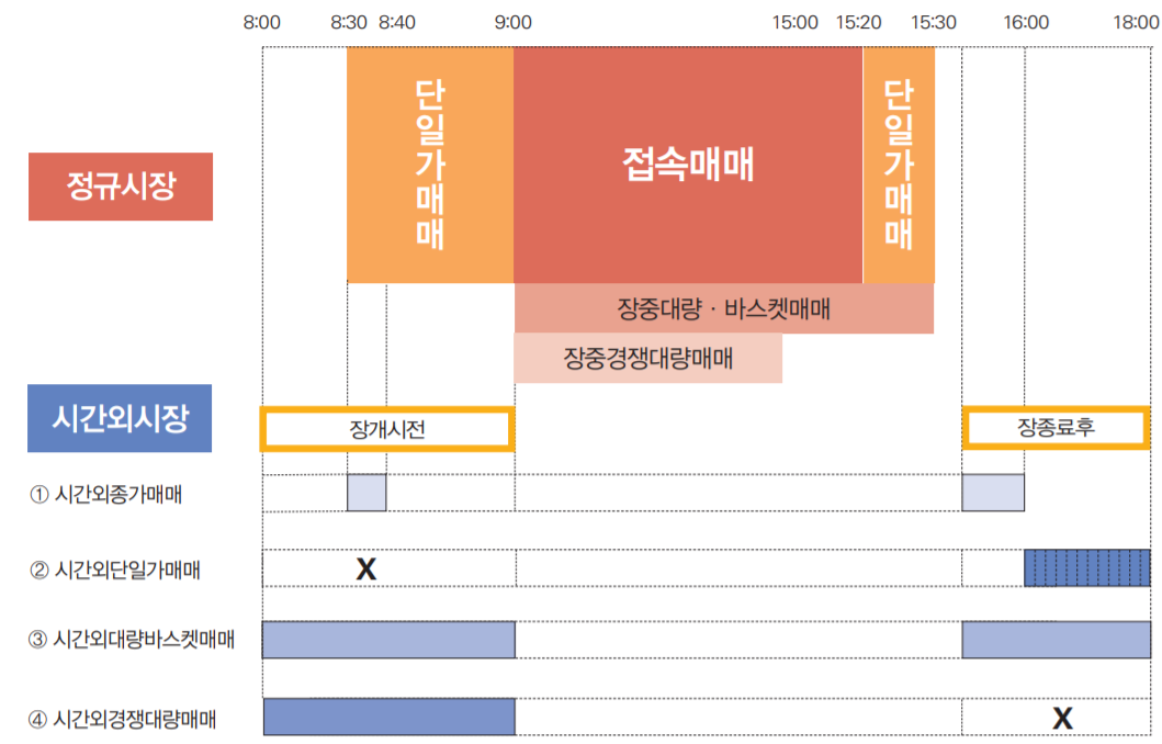 - 정규시장 외 추가적인 거래 수요를 충족하기 위해 개설한 "시간외시장"은 장개시 전 시간외 시장은 8시부터 9시, 장 종류 후 시간외 시장은 15시 40분부터 18시까지 운영합니다.