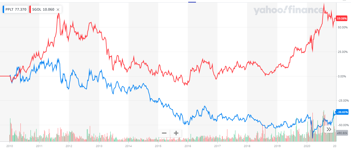 금 가격을 반영하는 ETF인 "SGOL"과 등락률을 비교해보면 비교대상 초기부터 가격 차이가 확 벌어지는데요, 백금을 장기투자 대상으로 가져가기는 어려워 보입니다.