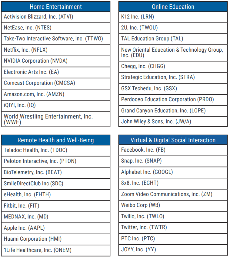 | 홈 엔터테인먼트 | 스트리밍 서비스, 게임, E-스포츠와 관련된 회사를 편입함. 스트리밍 서비스를 추가로 구독하거나 e-스포츠와 게임에 더 많은 시간을 할애할 것으로 예상됨 |