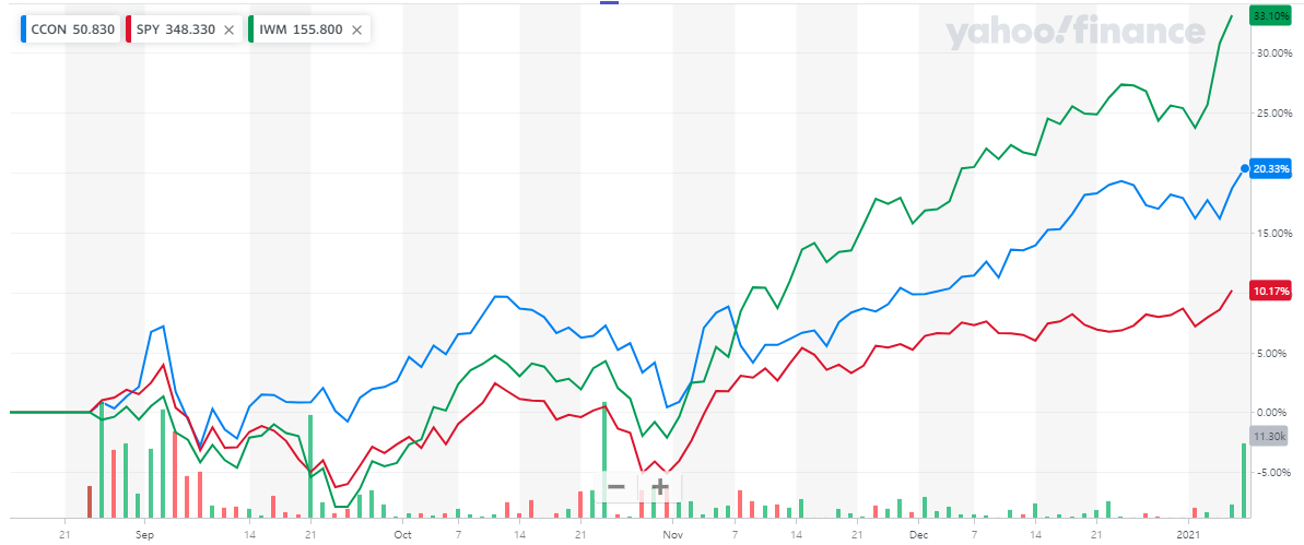 이 기간은 코로나 19 사태로 인해 수혜를 입은 업종이 주로 상승했는데요, S&P 500 지수보다 CCON이 성과가 더욱 좋은 것을 알 수 있습니다.