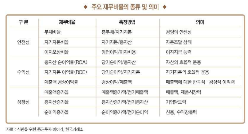 주요 재무비율들은 재무제표 상에 데이터로 기록되어 있으며, 이러한 데이터를 기반으로 현재 증권시장에서 거래되는 주식의 가치와 비교함으로, 현재까지의 성과와 미래에 대한 전망을 나타내는 비율이 있습니다.