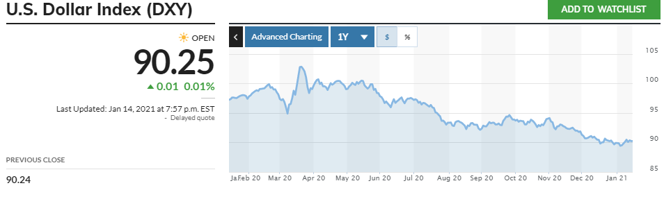 위 표는 미국 달러의 2020년 1월부터 2021년 1월까지의 등락률을 보여주는 그래프입니다.