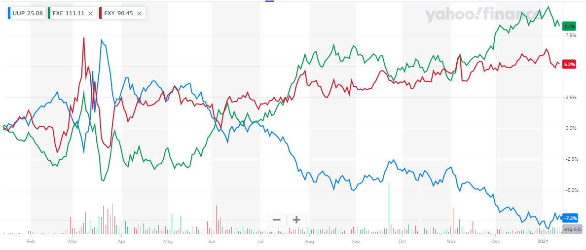 위 표는 앞서 소개한 통화 ETF 3종의 1년(2020년 1월 ~ 2021년 1월)간의 등락 그래프입니다.