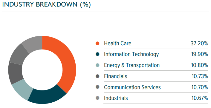 - 헬스케어 섹터가 37%로 1위며, IT와 에너지, 운송주, 금융주 등이 균등하게 포함되어 있습니다.