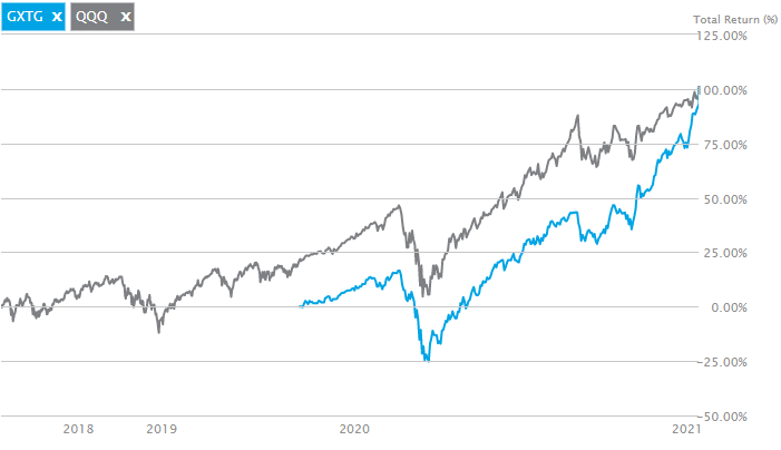 GXTG는 상장 이래로 2021년 1월인 지금까지 QQQ의 수익률을 능가하고 있습니다.
