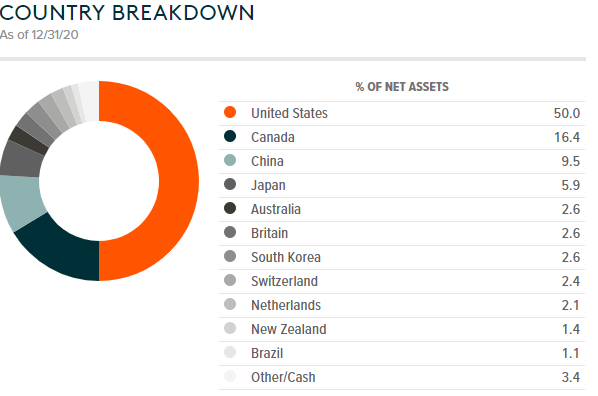 - 2020년 12월 31일 기준으로 미국에 상장된 종목이 반을 차지하고 있고, 그 이외 캐나다, 중국, 일본 등의 순으로 국가별 구성비율로 구성되어 있습니다.