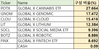 대마초 산업에 투자하는 POTX, 게놈 프로젝트에 투자하는 GNOM, 클라우드 산업에 투자하는 CLOU 등이 GXTG의 상위 구성 비율로 투자되어 있네요.