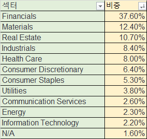 배당률이 비교적 많은 편인데요, 대표적인 배당 섹터인 금융주와 리츠가 많이 포함되어 있어서 배당률이 높게 나타나고 있는 것 같습니다.