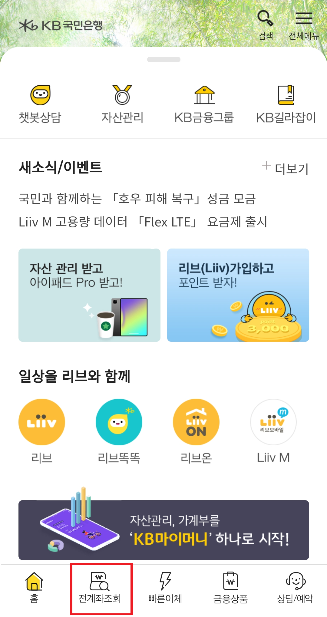 1. "KB스타뱅킹" 앱을 설치하여 실행합니다.