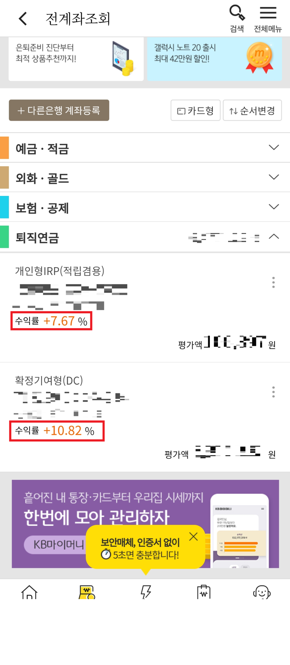 스마트폰에서 손쉽게 국민은행 퇴직연금의 수익률을 조회하는 방법을 알아보겠습니다.