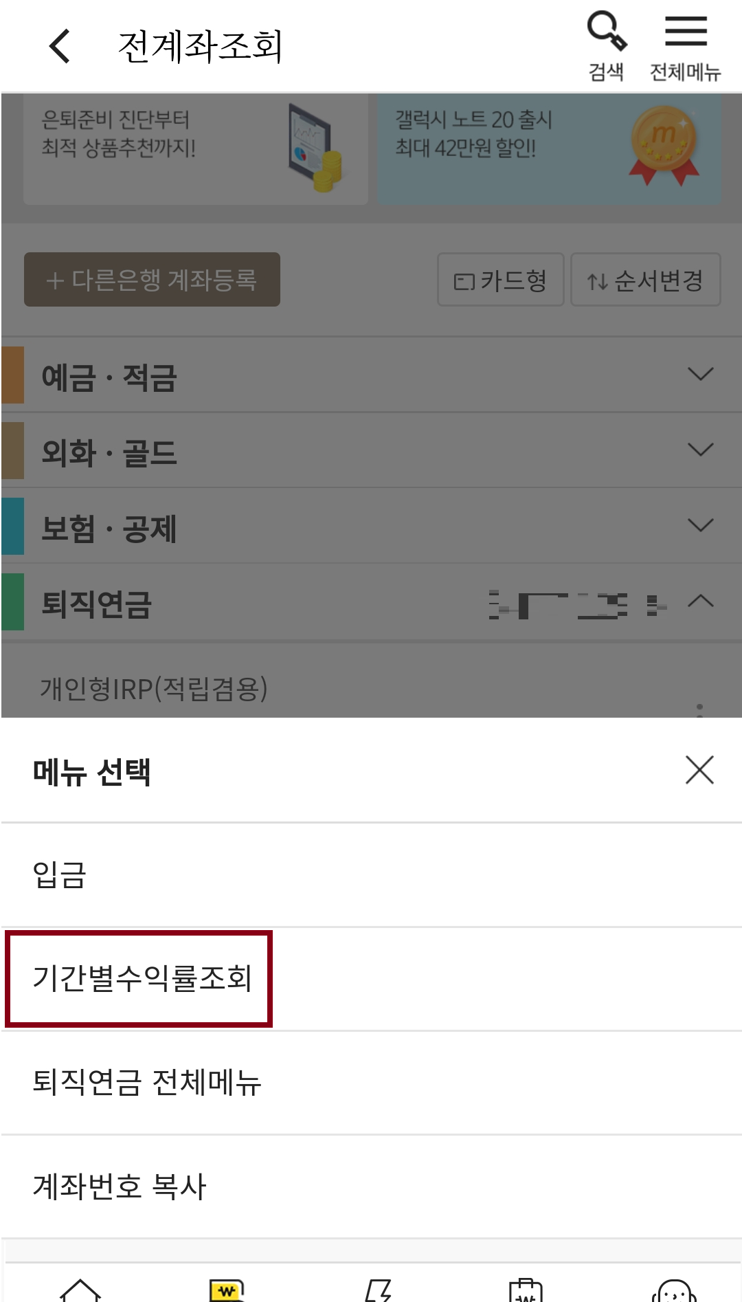 4. 가입한 퇴직연금(IRP, DC 등) 계좌에 대해 수익률을 확인하실 수 있습니다.