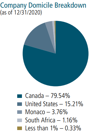 - 구성 국가가 94% 이상 북미에 투자되어 있는 것이 특징이며, 특히 캐나다의 금광 업체의 주식을 주로 보여하고 있습니다.