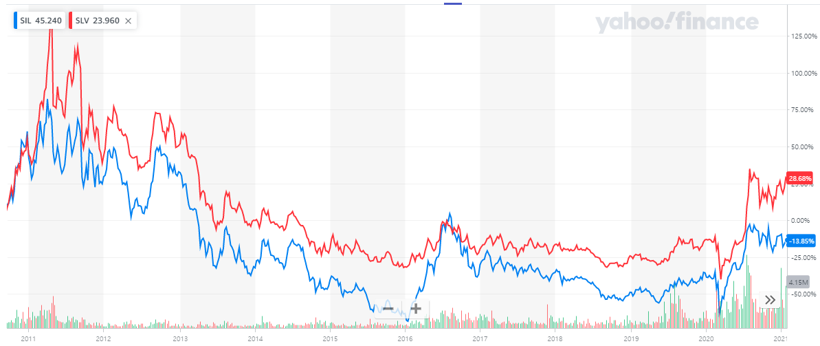 즉, 은 자체에 투자하는 것보다 은과 관련된 회사에 투자하는 것이 더 변동성이 크다는 뜻입니다.