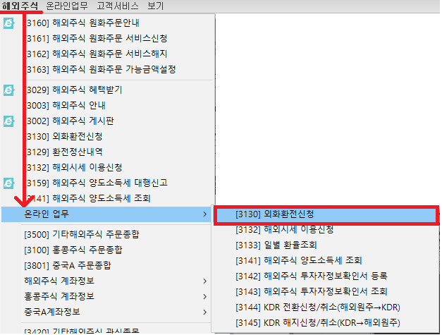 프로그램을 열어서 상단 "해외주식" 탭을 클릭하고 "온라인 업무" > "외화환전신청" 메뉴를 클릭합니다.