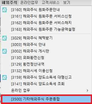 상단 "해외주식" 탭을 클릭하고 "기타해외주식 주문종합"을 클릭합니다.