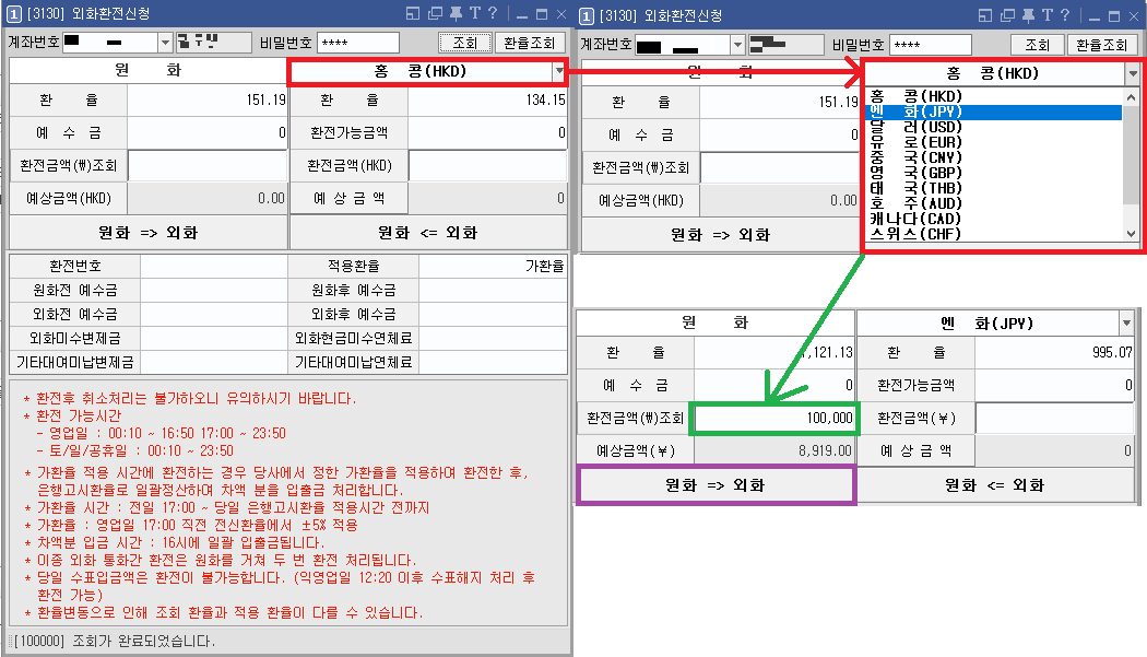 - "원화 => 외화" 버튼을 눌러 환전을 완료합니다.