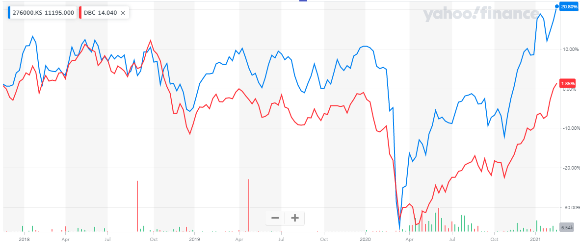 현재까지의 성과로만 판단한다면 TIGER ETF가 원자재의 대체투자재가 될 것 같습니다.