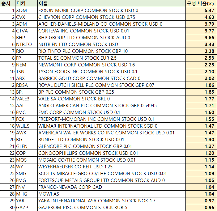- 이 ETF는 에너지, 금속, 농업, 목재, 수자원과 같은 천연 원자재와 관련된 사업을 영위하고 있는 기업을 담고 있습니다.