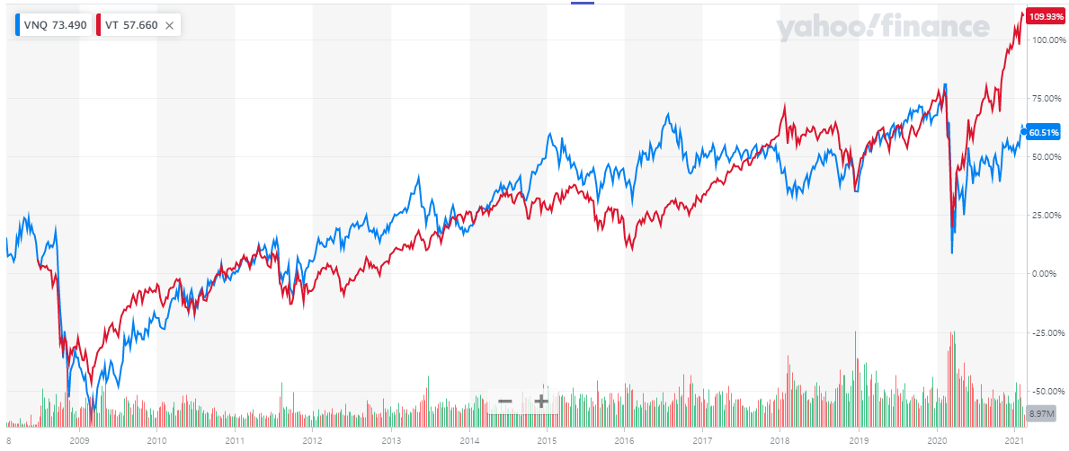 전 세계 주식시장에 투자하는 "VT" ETF의 등락률과 비교하면 리츠도 꾸준히 상승하며 시세차익까지 노릴 수 있다는 점입니다.