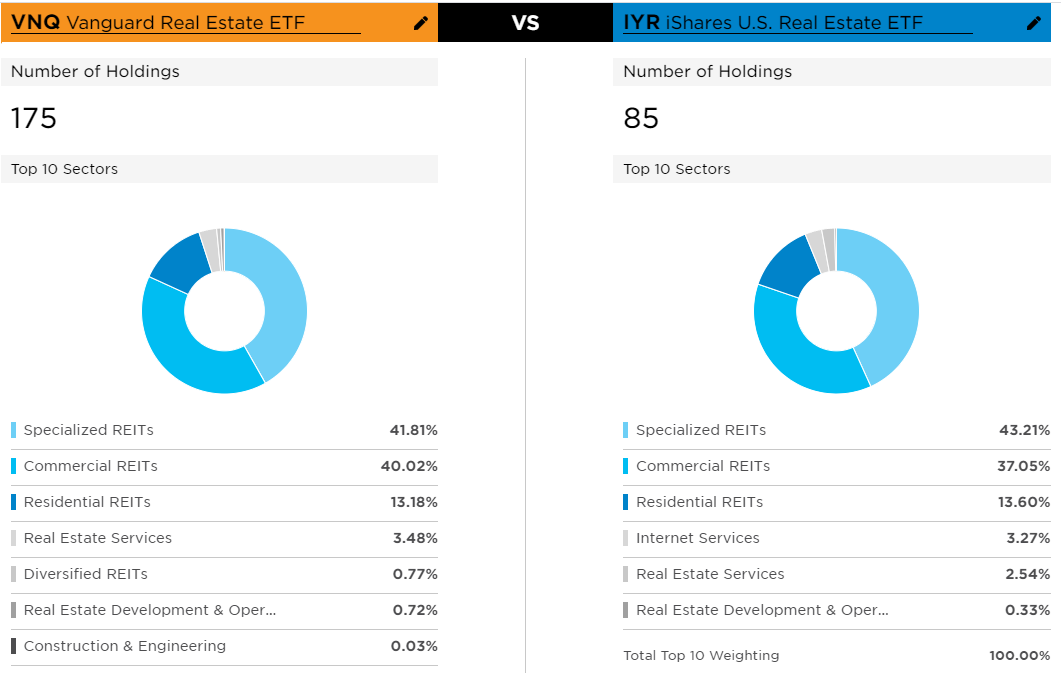 - 다만 가장 다른 점은, VNQ가 175개의 회사에 투자되어 있어서 IYR의 85개보다 2배 많습니다.