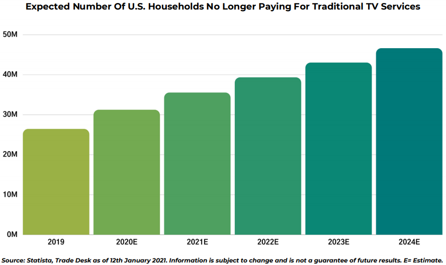 데이터 분석 기관인 미국의 Statista 사는 2021년에 미국 가정의 27%가 케이블 TV 서비스를 종료하겠다고 예상하기도 했습니다. 그리고 시간이 지날수록 점점 전통적인 케이블TV 시청자 수는 줄어들 것이라고 예상합니다.