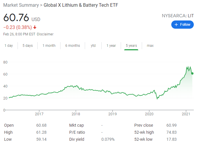배터리와 관련된 미국 ETF인 "LIT"도 엄청난 성장세를 보이는데요, $30 선에서 맴돌던 주가가 2021년 초에는 $70까지 성장하고 있습니다.