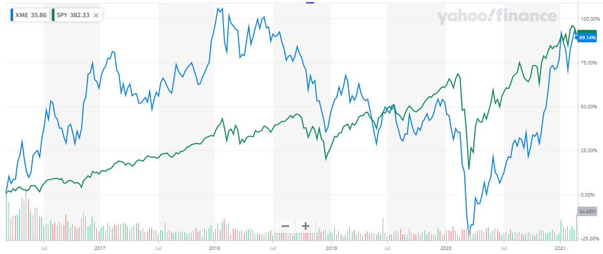 S&P500을 추종하는 ETF인 SPY와 비교해보면, 확실히 XME의 변동성이 강한 편이라는 것을 알 수 있습니다.