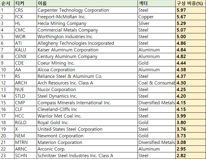 - XME는 현재 23개의 종목으로 구성되어 있습니다.