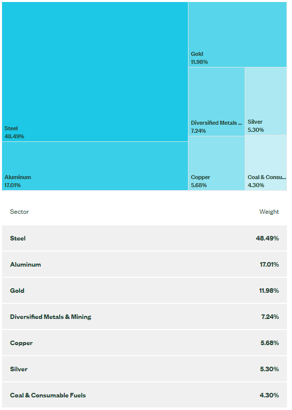 - 철과 관련된 회사가 가장 많이 포함되어 있고, 그다음으로는 구리, 알루미늄, 금 순으로 포트폴리오에 구성되어 있습니다.