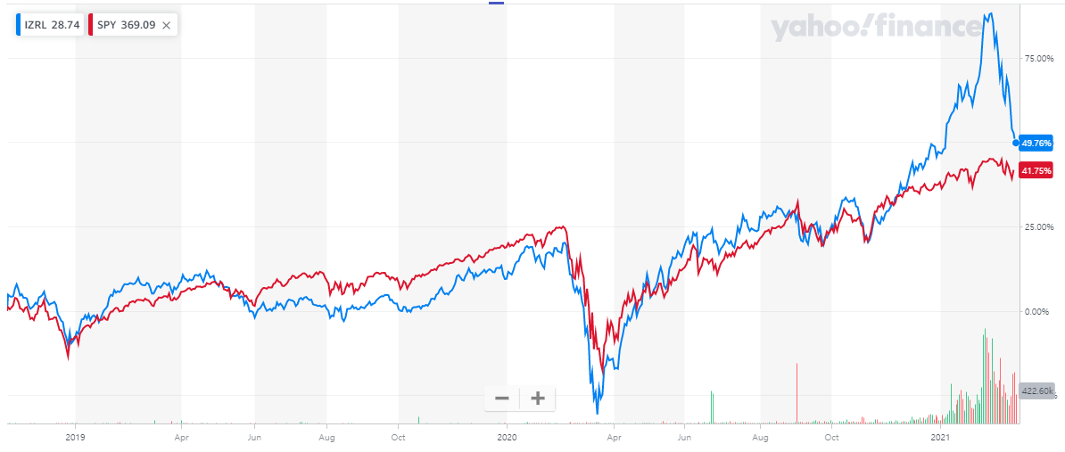 IZRL의 성과를 미국의 S&P500 지수를 추종하는 ETF인 "SPY"와 비교해보도록 하겠습니다.