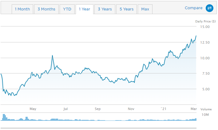 2020년 2월부터 2021년 2월까지의 1년간 단기 그래프를 보면 천연가스 투자의 성과는 좋습니다.