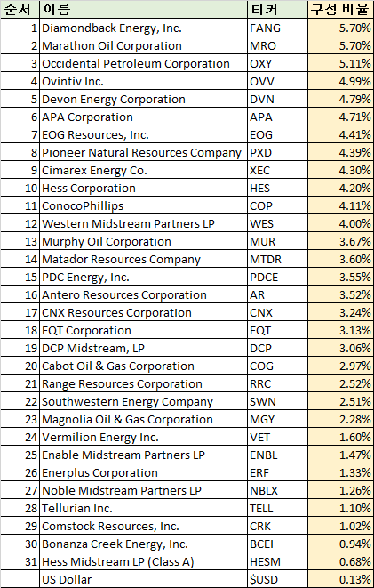 - 현재 미국에 상장된 31개의 종목으로 구성되어 있습니다.