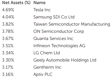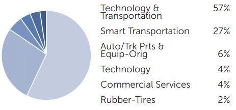 - 운송과 관련된 기술주에 57%로 가장 많이 투자되어 있으며, 스마트 운송, 자동차 부품과 관련된 섹터에도 투자됩니다.