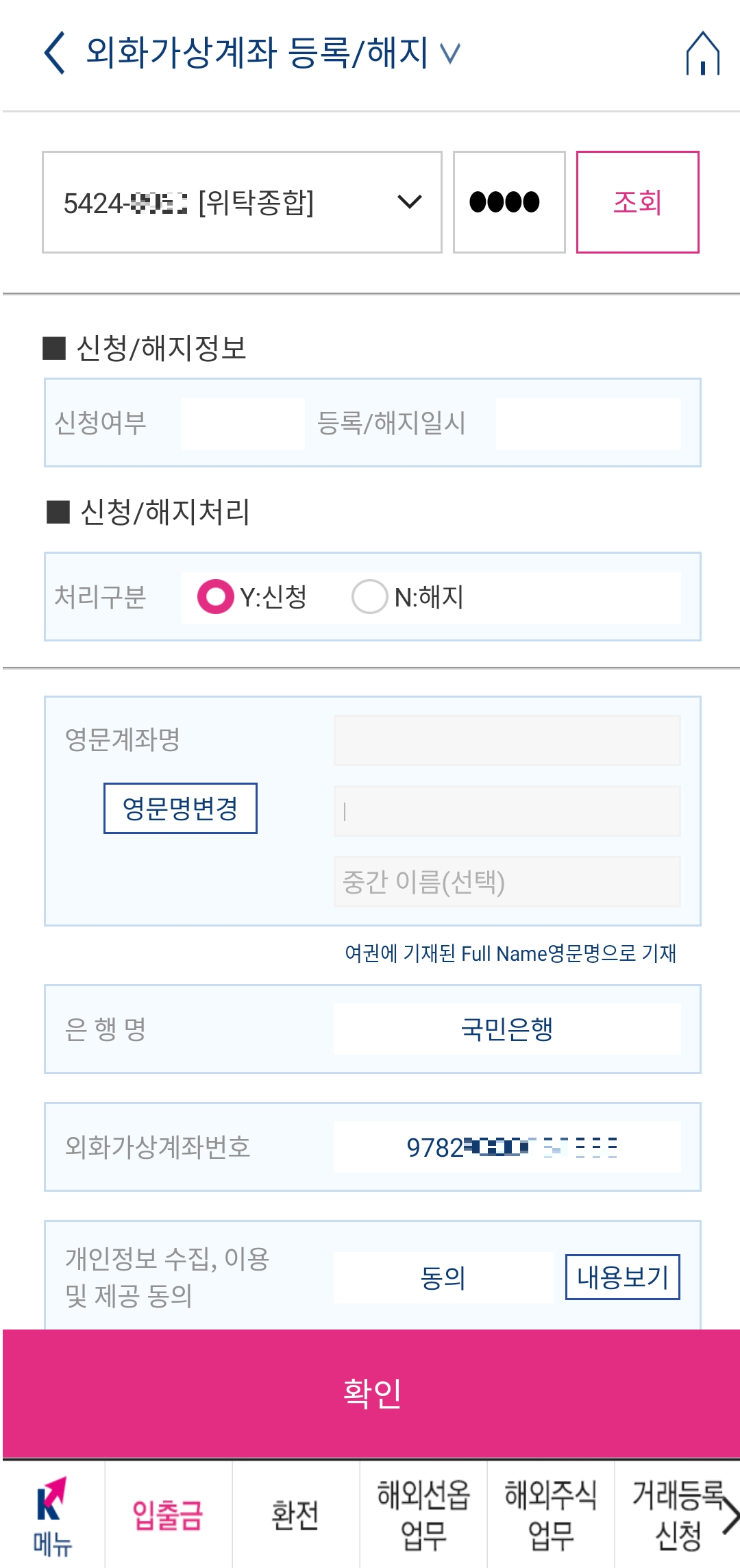 3. 영문계좌명을 여권의 Full Name 영문명으로 기재하고 확인 버튼을 누릅니다.
