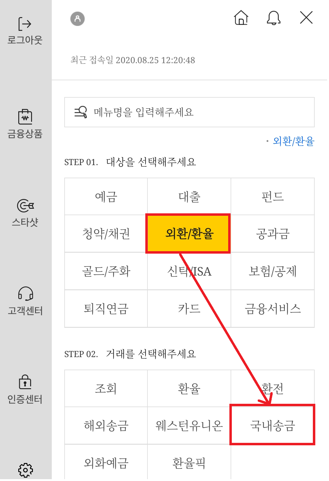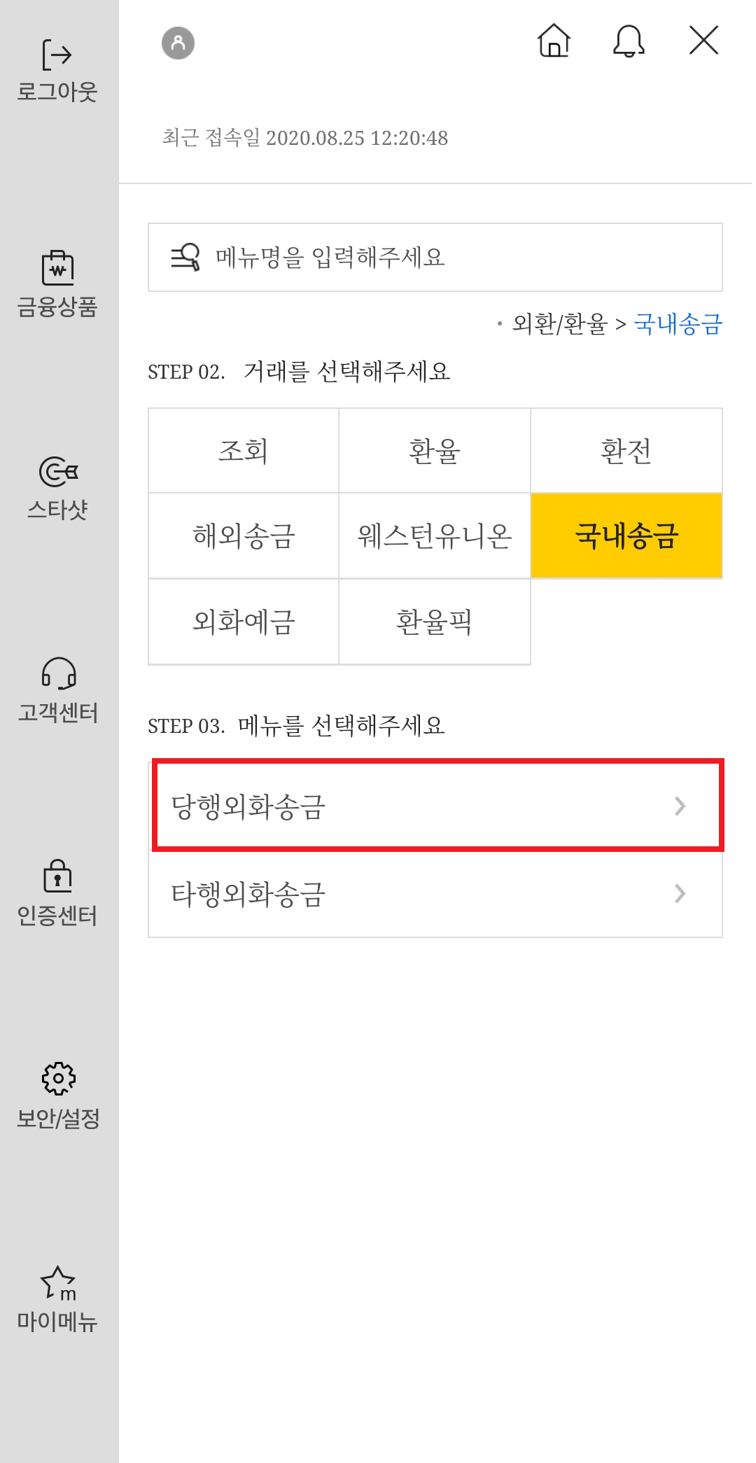2. 외환/환율 > 국내송금 차례로 클릭합니다.