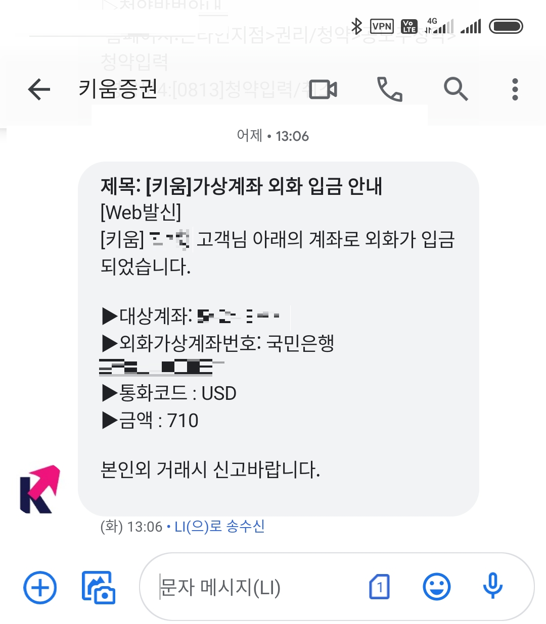 - 문자메시지 통보 서비스를 신청했다면, 문자메시지로로도 가상계좌 외화 입금 안내를 통보해 줍니다.